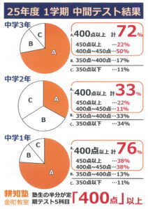金町教室の25年度1学期中間テスト結果は以下の通りです。